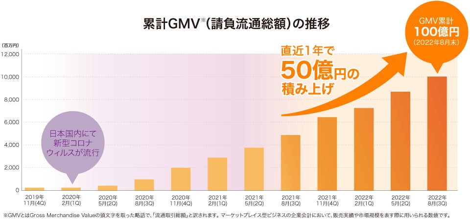 うちGMV50億円は、新型コロナウイルスの国内感染状況を鑑みながら、住宅メーカーの登録促進や顧客応対品質の向上等を図ったことにより、2021年8月からの直近1年間で積み上がったものです。通算2年6ヶ月の間で、展開エリア3.6倍、登録社数3.1倍、累計GMVにおいては37.2倍と、その実績は目覚しい成長を遂げています。